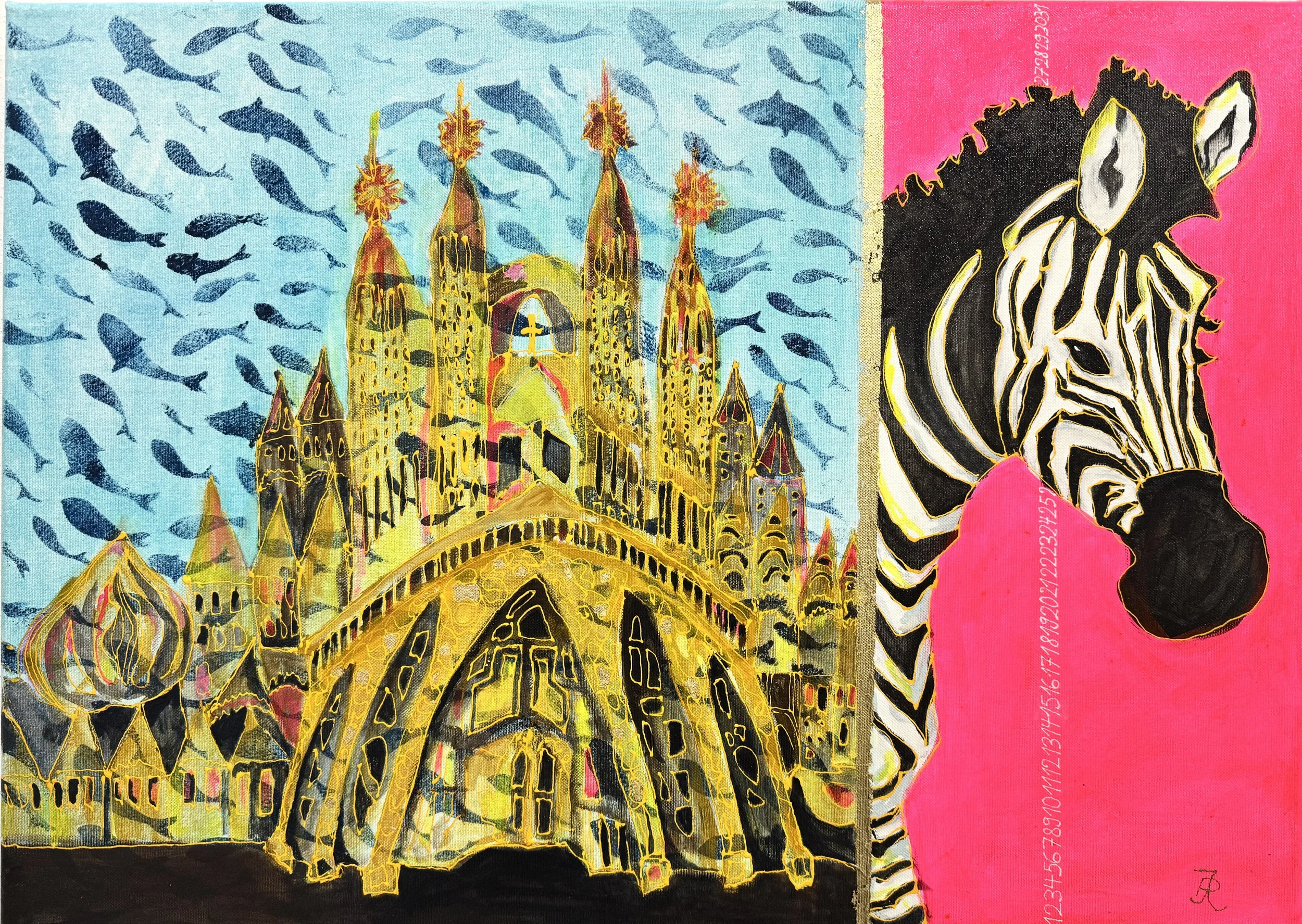 Die Anforderungen für dieses Gemälde waren wie folgt: eine 31 jährige Zusammenarbeit mit einer Schaufensterdekorateurin sollte gewürdigt werden. Aus der Zahl 31 entstand somit eine Zeitleiste. Ein besonderer Meilenstein war ein Preisgewinn für die beste Schaufensterdeko. Diese bestand u.a. aus Zebras. Als Gewinn durfte das Team nach Barcelona fliegen. Dort besuchten sie die Sagrada Familia und aßen Sushi (repräsentiert durch die Fische).